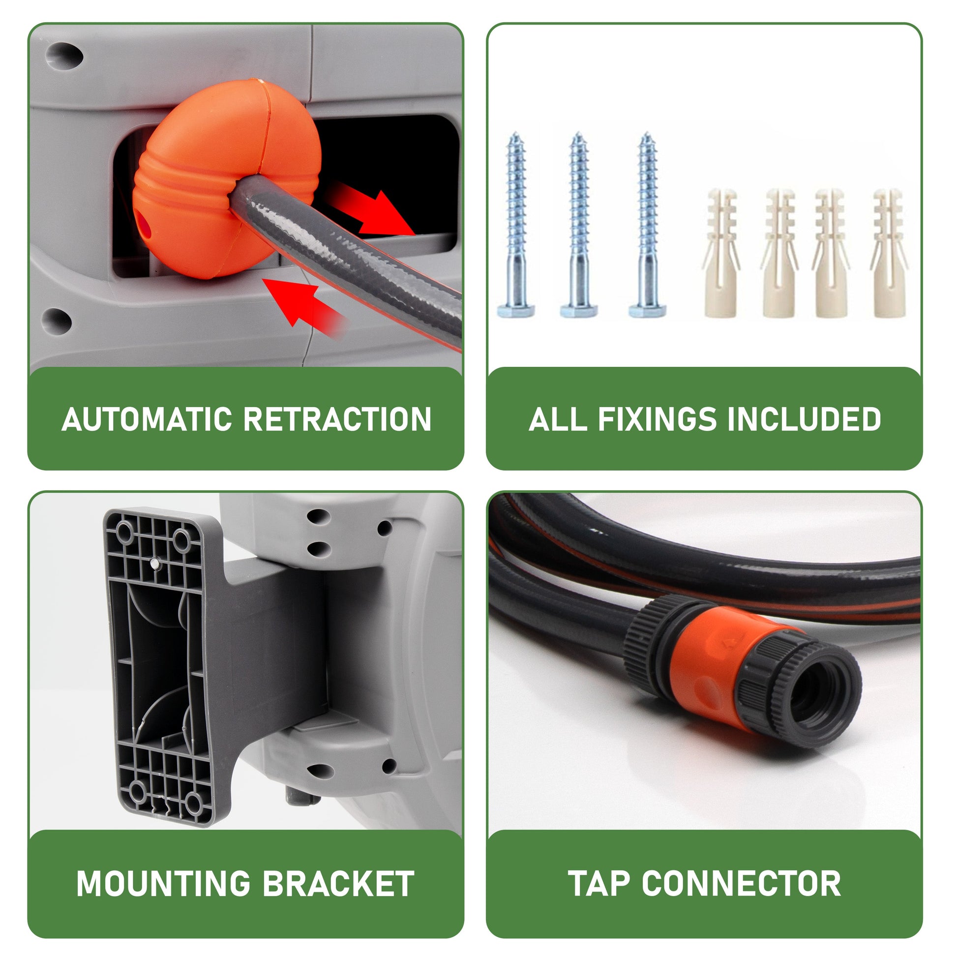- The reel is designed with auto-rewind system, which helps retract the hose smoothly with a stable and safe speed. It is also worth mentioning that the locking ball can adjust and lock the hose at your desired length.