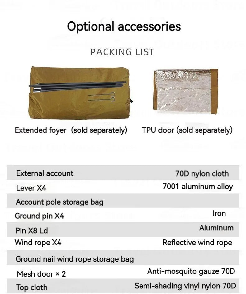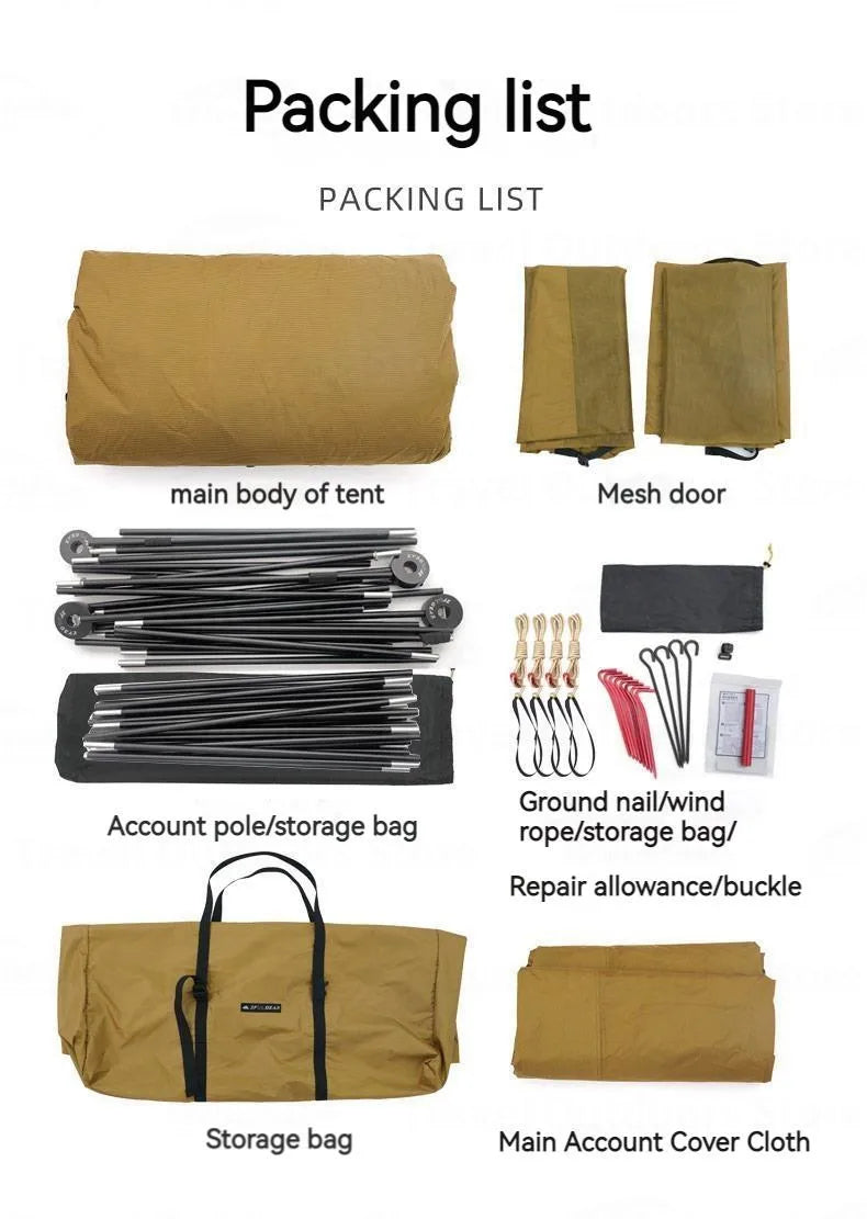 Product list: tent body, mesh door, tent poles/storage bag, main tent cover cloth, tent storage bag, ground pegs/wind rope/storage bag/repair allowance/pull buckle