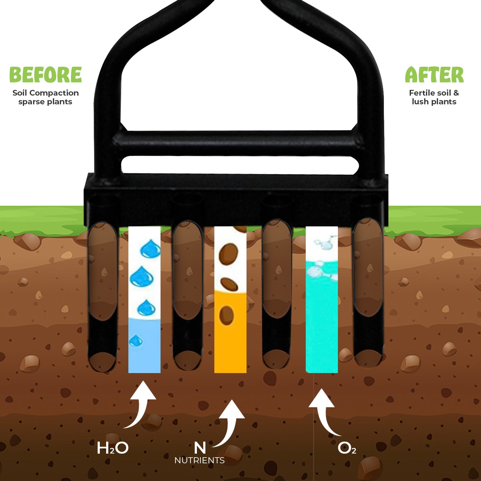 The lawn aerator helps you grow a lush, green lawn. This product lets air, water, and nutrients reach grass roots for a greener, more beautiful lawn. The aerator is made from high-quality steel and has 5 hollow prongs for extracting small plugs of soil to aerate the lawn deeply and completely. Breathes new life into your lawn without harmful and expensive chemicals.