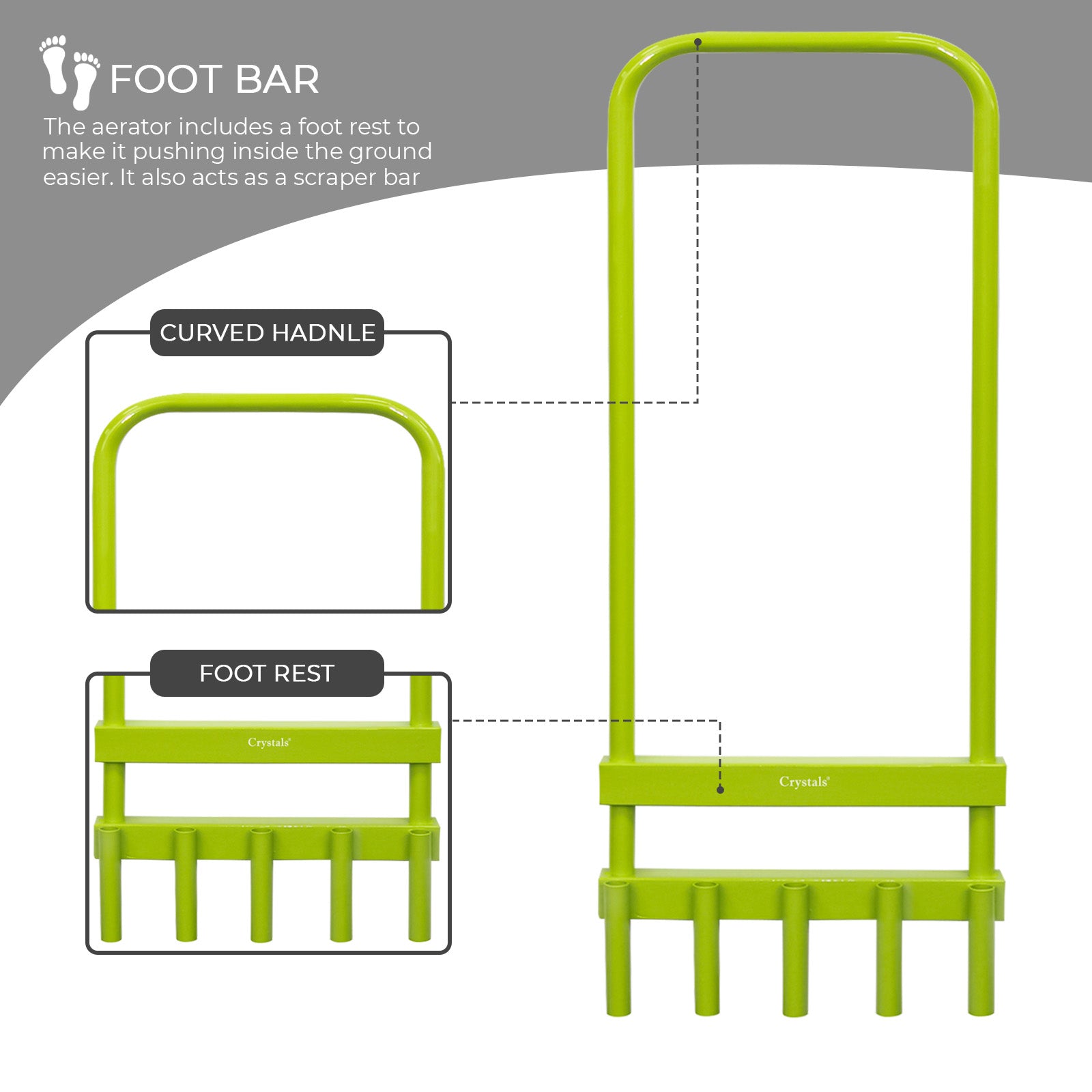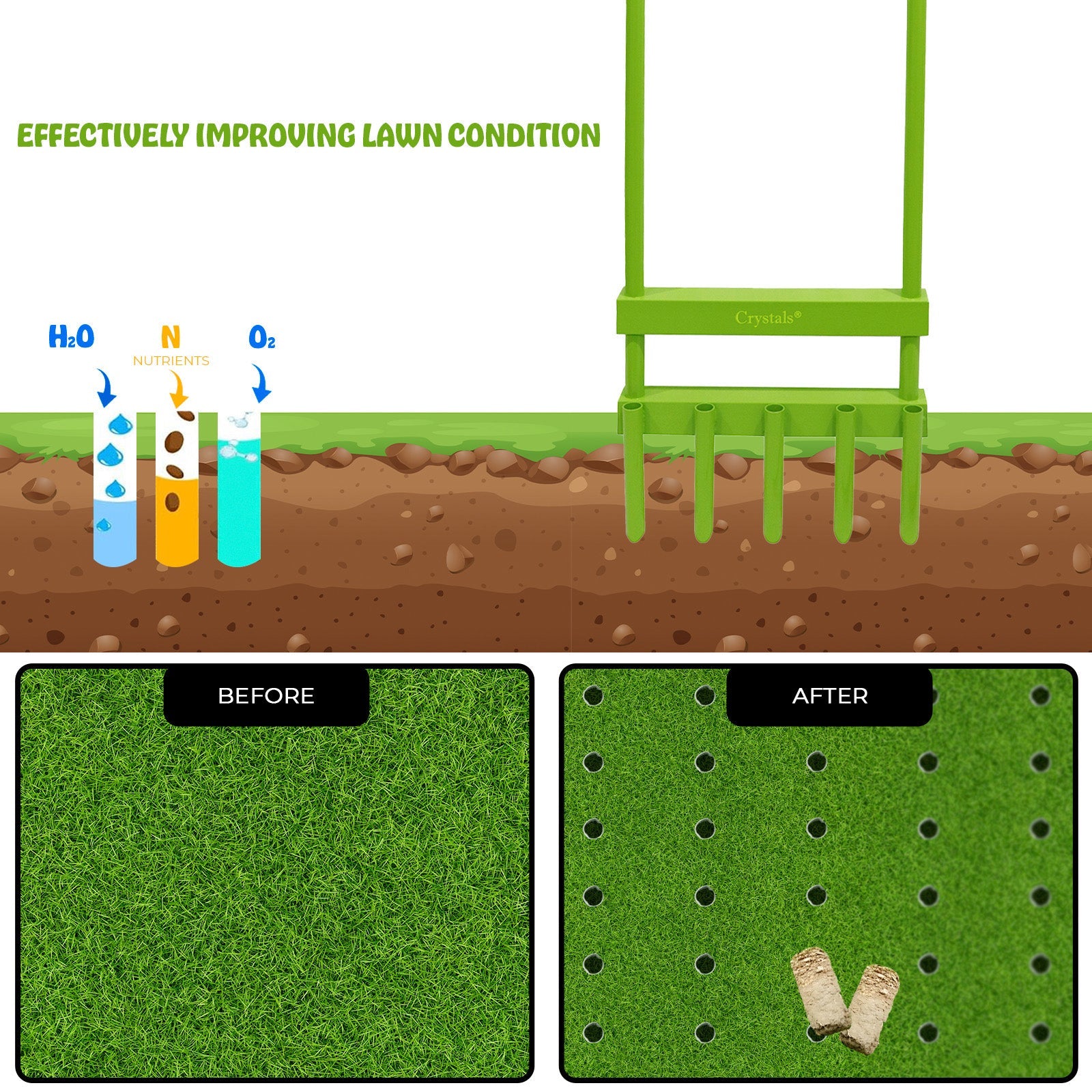 The lawn aerator helps you grow a lush, green lawn. This product lets air, water, and nutrients reach grass roots for a greener, more beautiful lawn. The aerator is made from high-quality steel and has 5 hollow prongs for extracting small plugs of soil to aerate the lawn deeply and completely. Breathes new life into your lawn without harmful and expensive chemicals.