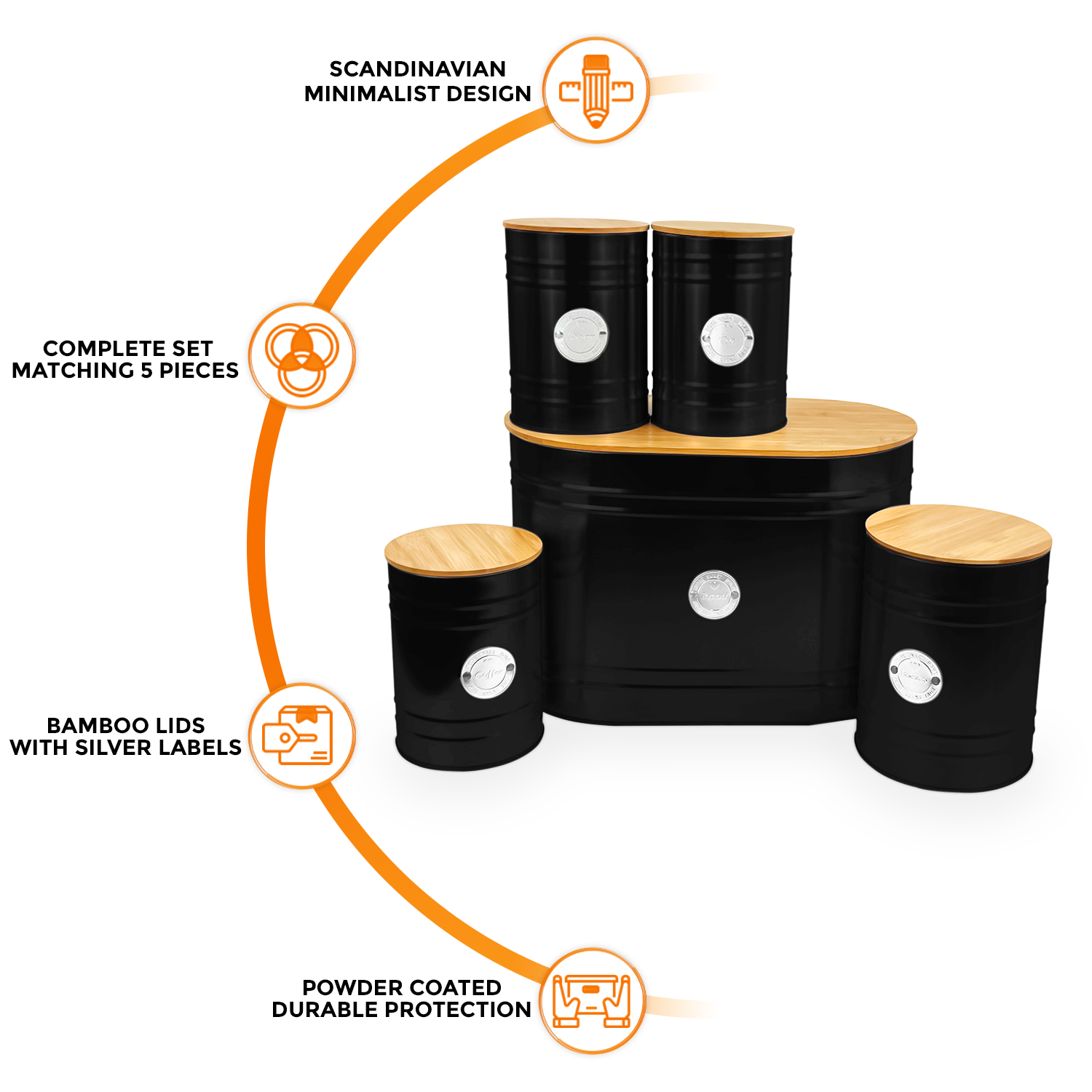 - 5-piece set; Includes 3 canisters for tea, coffee and sugar with lids, and a bread bin and biscuit tin