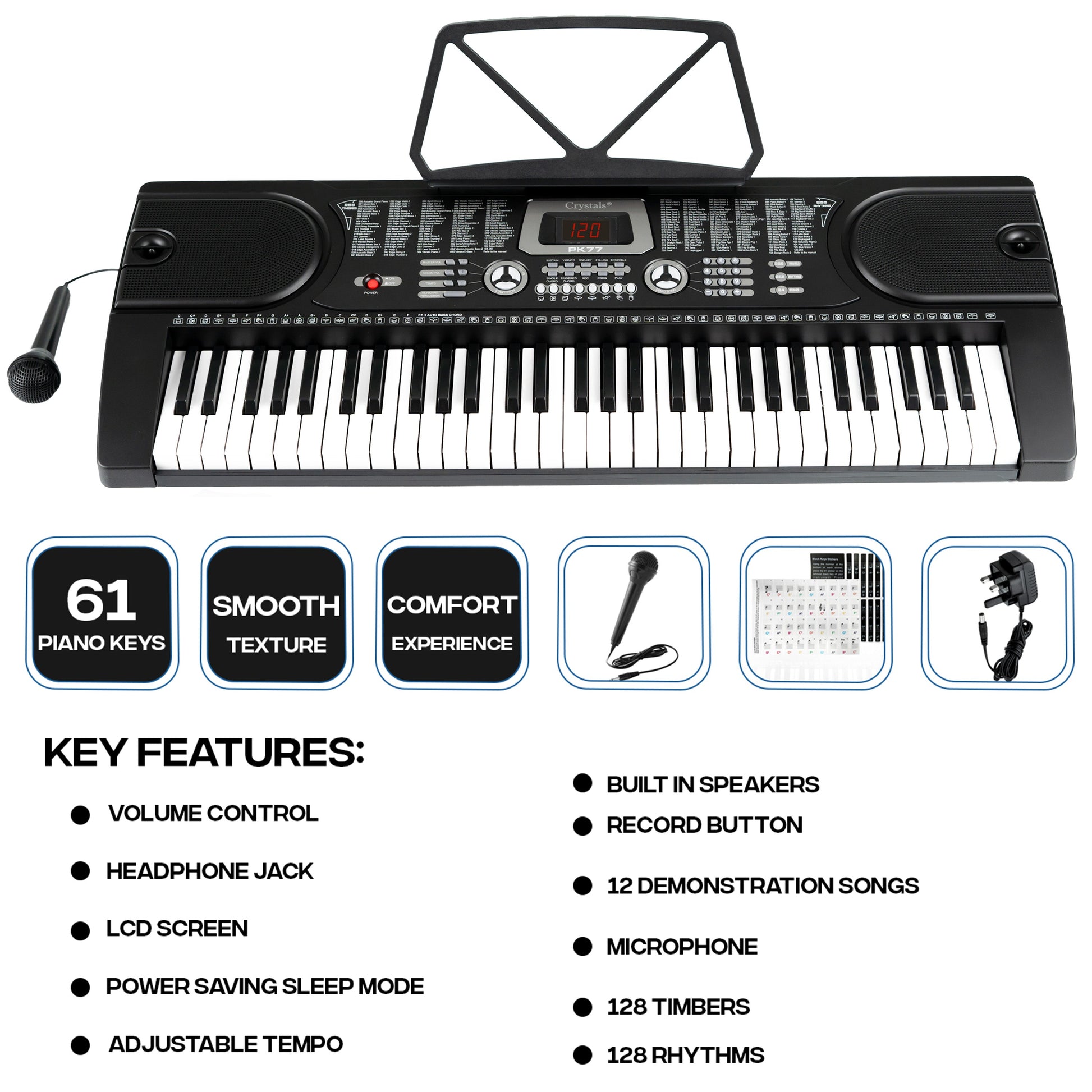 61 keys electronic teaching keyboard digital music piano is ideal for beginners with its built-in intelligent guide features and fun functions that help develop music skills and take your musical talent to the next level. It has features of easy-to-read and clear labelling, making music with this keyboard is fun and hassle-free. Impress all your friends and family by mastering different songs using the unique guide functions, including one-key, follow and ensemble tutorials. The innovative follow function will wait until you play the notes correctly before continuing, acting as a virtual music teacher. This keyboard is perfect for those taking their first steps in music and is a great way to develop their knowledge and skills whilst having fun.