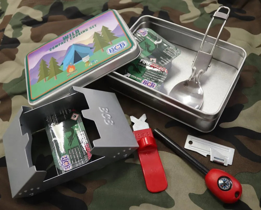 Contents include: Folding cooker c/w Windbreaker FireDragon Fuel Tablets x 3 Fireball Flint & Striker c/w Mini Compass Folding Spoon & Fork Can Opener