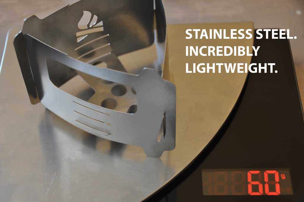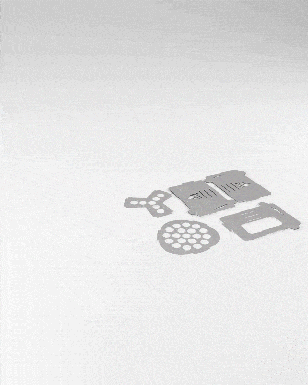 Ultra-light and still a fully functional multi-fuel stove. Only 60g (2.15 oz.) in the lightest configuration, with a base plate 70g (2.47 oz.). Disassembled: 12x9 cm, only 1.5 MILLIMETERS thick.