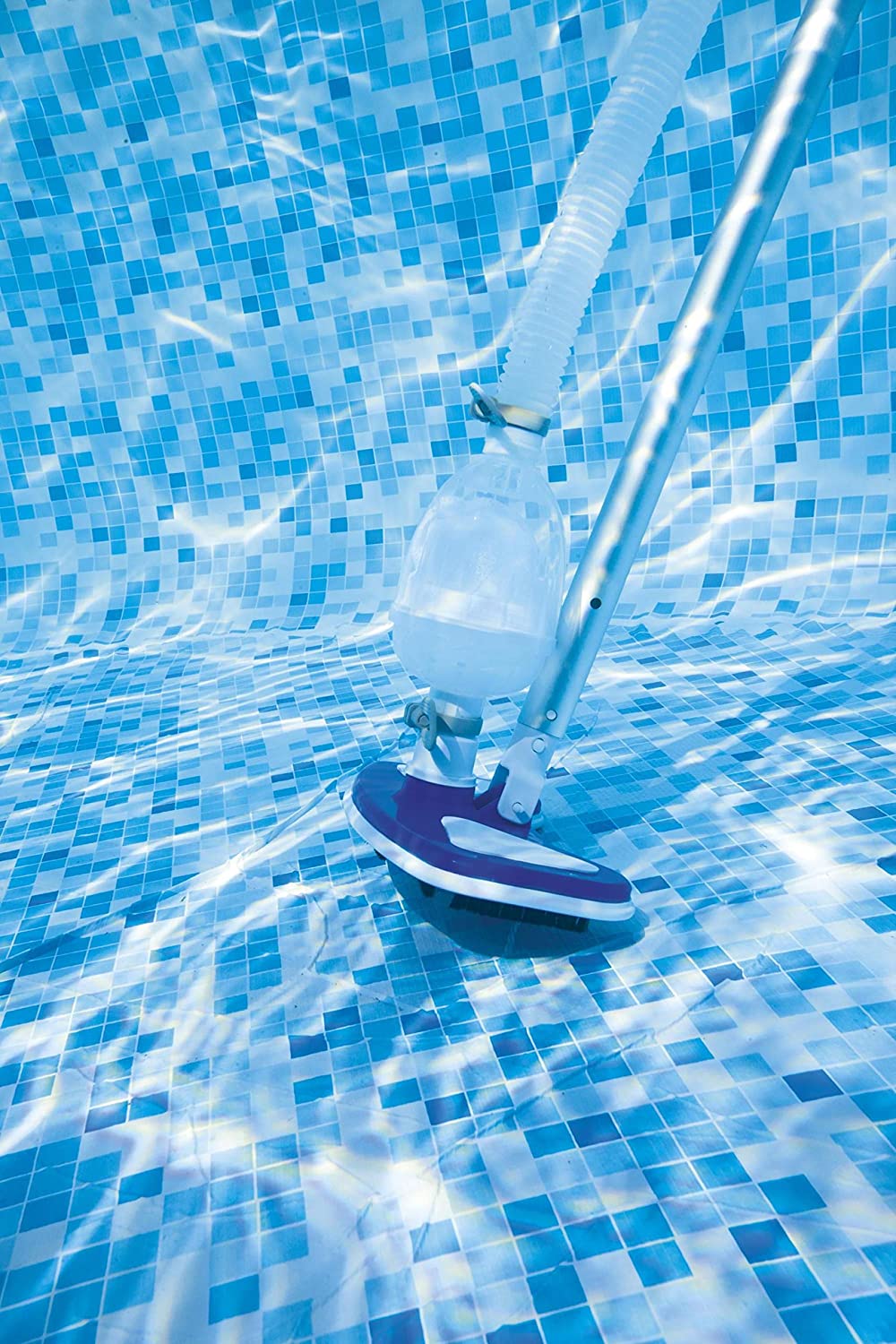 Bestway Deluxe Swimming Pool Maintenance Kit contains all the equipment you could possibly need to rid your above ground pool of dead beetles, rotting leaves and other debris. The set includes a 6m hose and an adjustable 2.79m aluminium pole which are perfect for cleaning and maintaining large pools. The pole can be attached to a skimming net so that floating debris can be scooped up and discarded. It can also be connected to the pool vacuum which is attached to a filter pump using the 6m hose. The vacuum is used for clearing algae and grime from the walls and floor of a pool and comes with attachments to fit a variety of filter pump. The maintenance set also includes an automatic surface skimmer. The skimmer's hose attachment connects to the swimming pool inlet, where water is drawn out by the external filter pump. As water is sucked towards the surface skimmer its straining basket traps debris, such as dead beetles and fallen leaves. Bestway Deluxe Swimming Pool Maintenance Kit contains all the equipment you could possibly need to clear debris and makes a fantastic maintenance starter set.