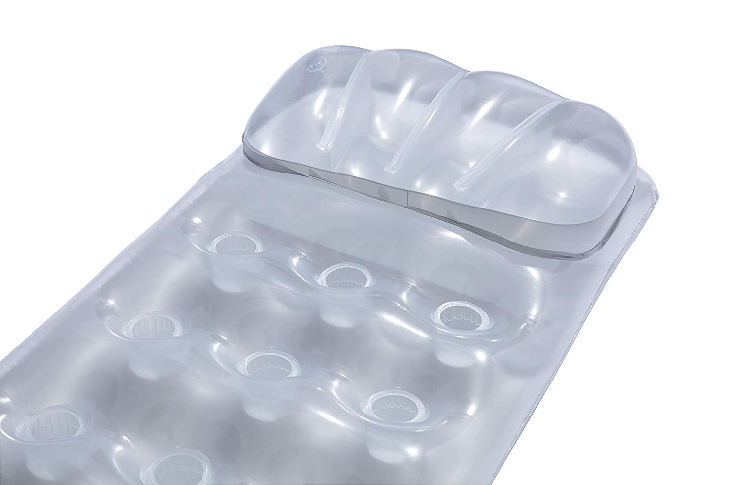 Safety valves Sturdy pre-tested vinyl 2 air chambers Sturdy coil beam construction Comfortable I-beam pillow Transparent top Repair patch Full color box Max. load capacity: 90kg Numbers of users: 1 adult Content: One lounge, one repair patch.