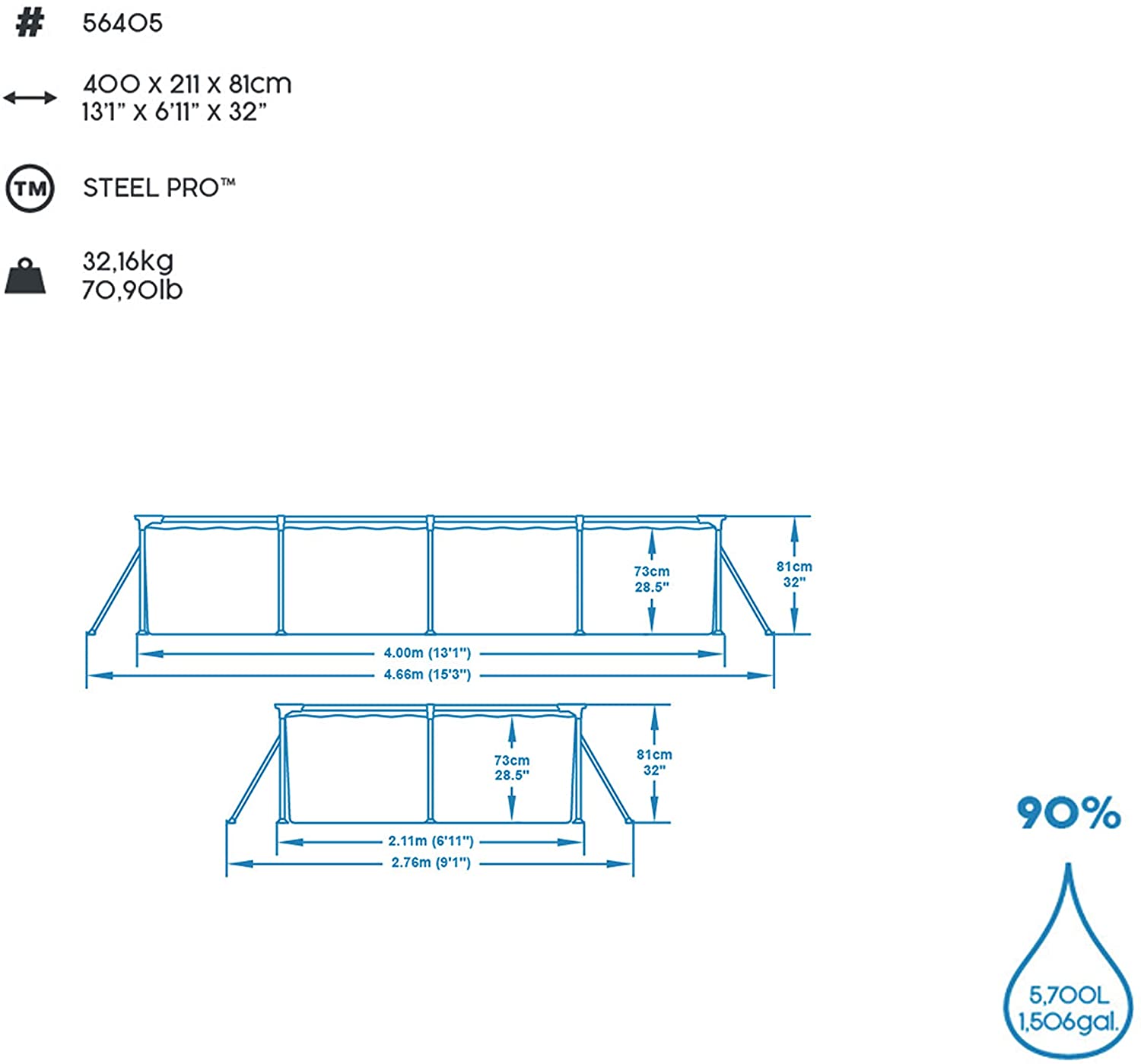 - DIMENSIONS: L 4.00m (13’1”) x W 2.11m (6’11”) x H 81cm (32”), Water Capacity 5,700 L