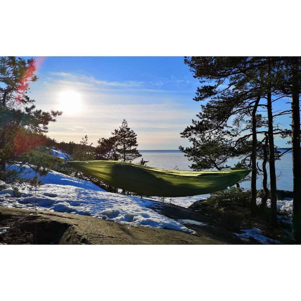 Although an extremely low weight, the hammock can still hold loads up to 130kg. This model with its dark olive colour blends easily into natural surroundings.