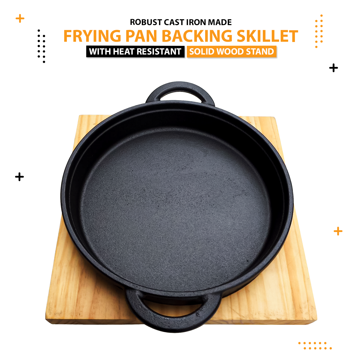 Highly finished traditional pre-seasoned cast iron construction Stunning Frying, Grill and Backing Pot Pan Platter Plate with Palm Wood Serving Board Set helps you to cooking tasty and healthy meals in rapid and efficient way. ✔It has features with two sided handles for cooking and serving.