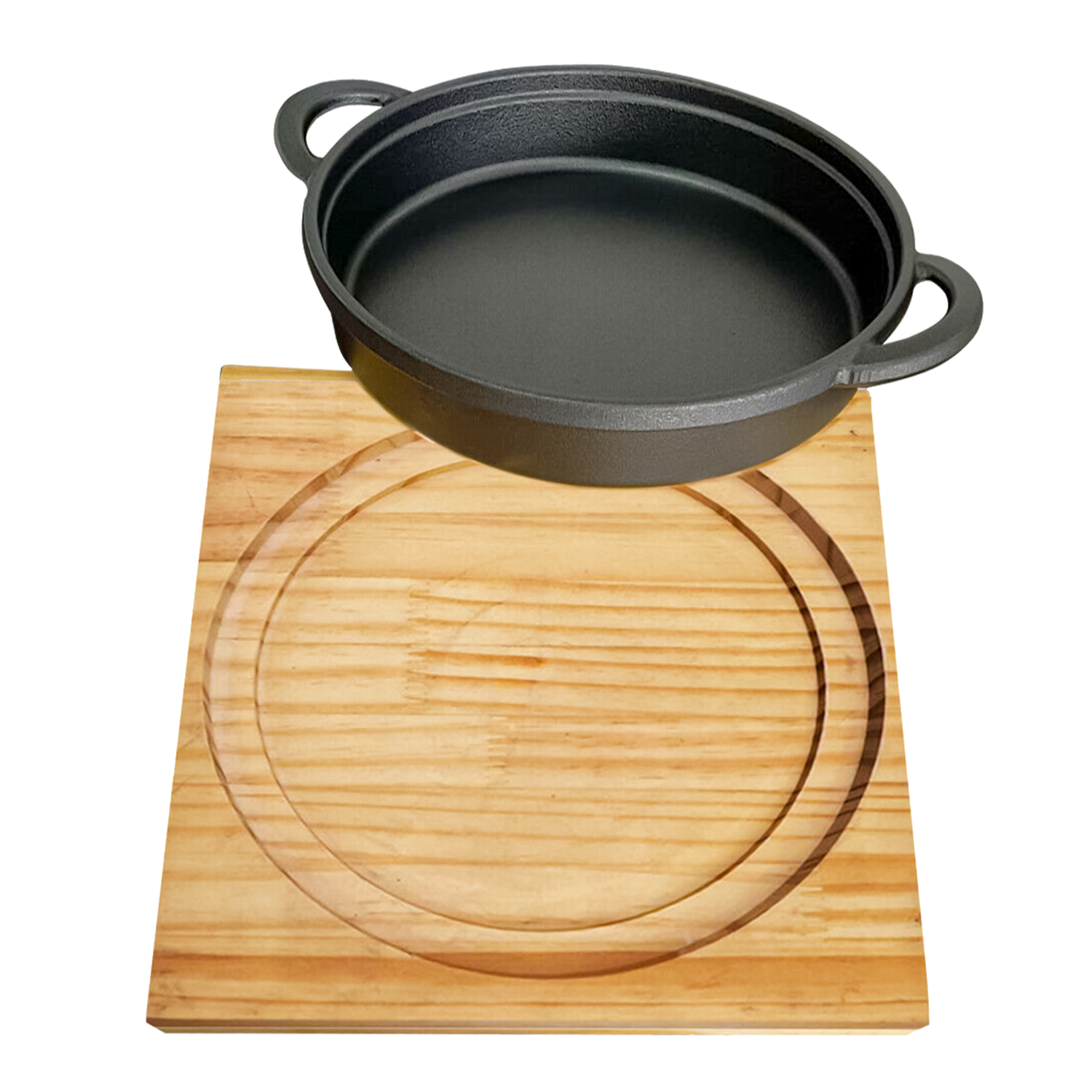 - TRADITIONAL CAST IRON POT WITH SERVING BOARD: Cast iron round shape frying pot pan sizzling platter skillet with palm wooden serving board base and features two sided handles for cooking and serving