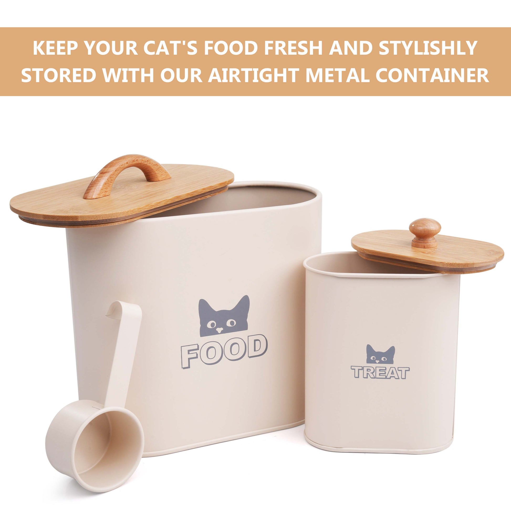 - 2-Container Set with Scoop– Includes one large container (20cm x 10cm x 18cm) for dry cat food and one smaller container (12cm x 6.5cm x 14cm) for treats or snacks.