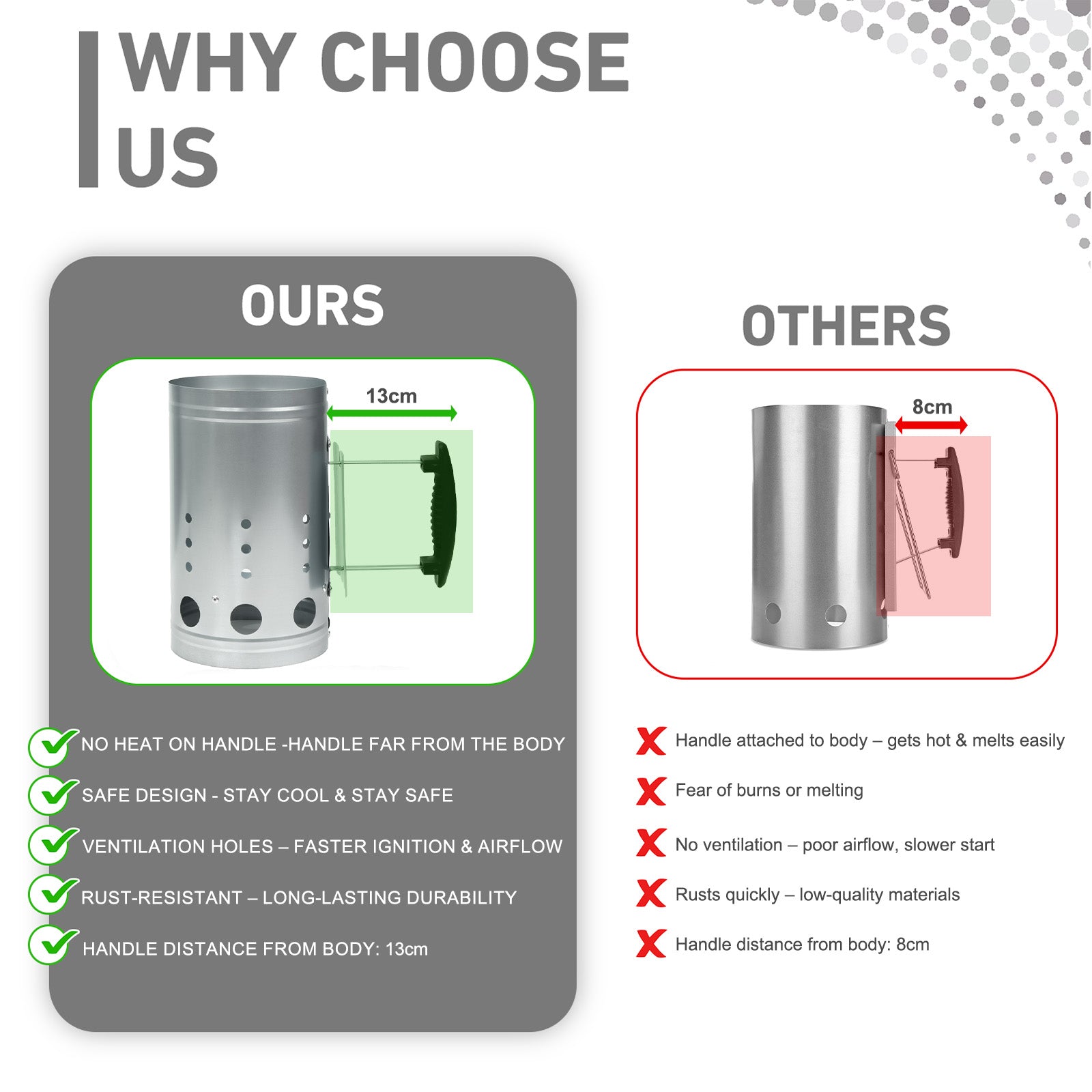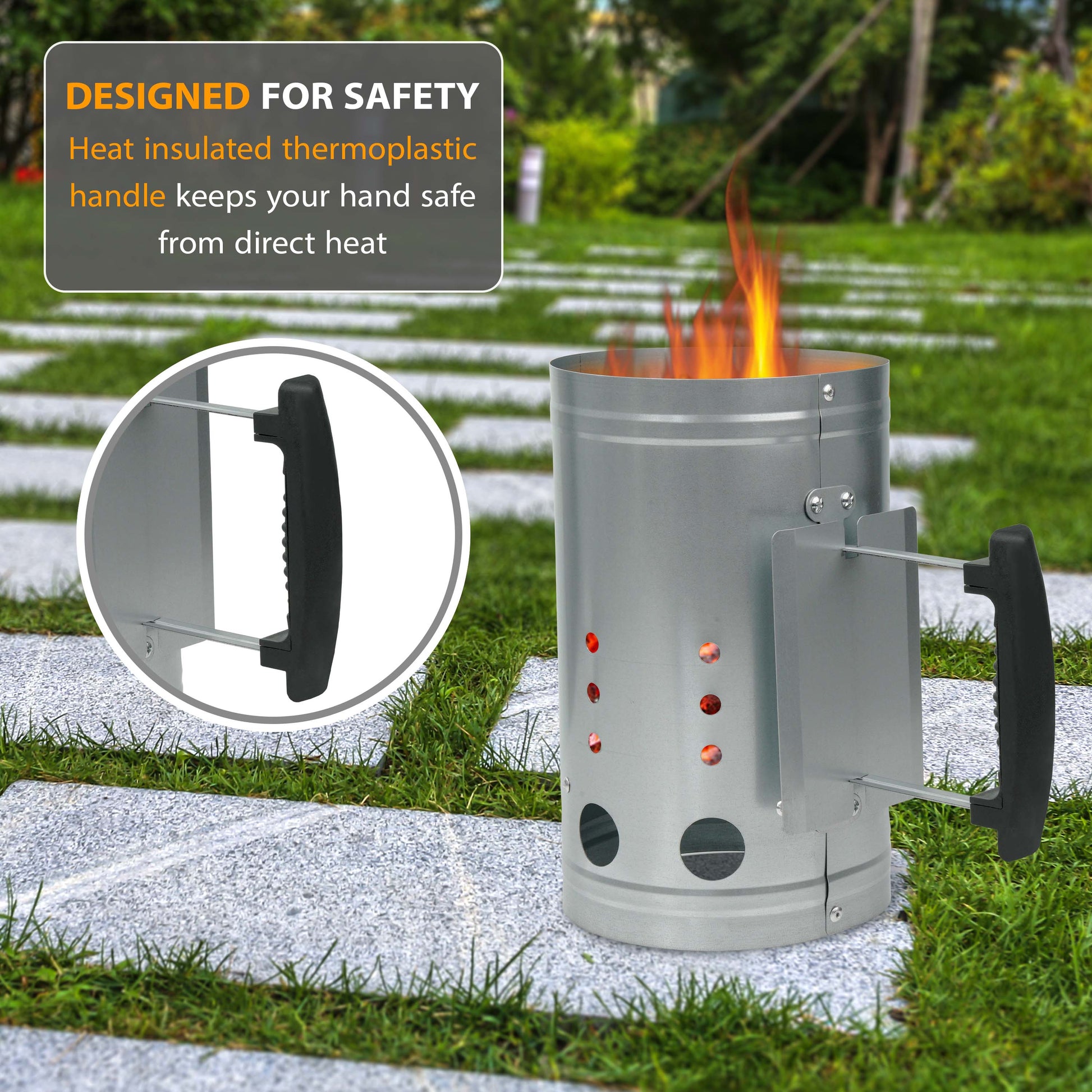 - Safety Guard & Metal Handle: Added protection and control while pouring hot coals.