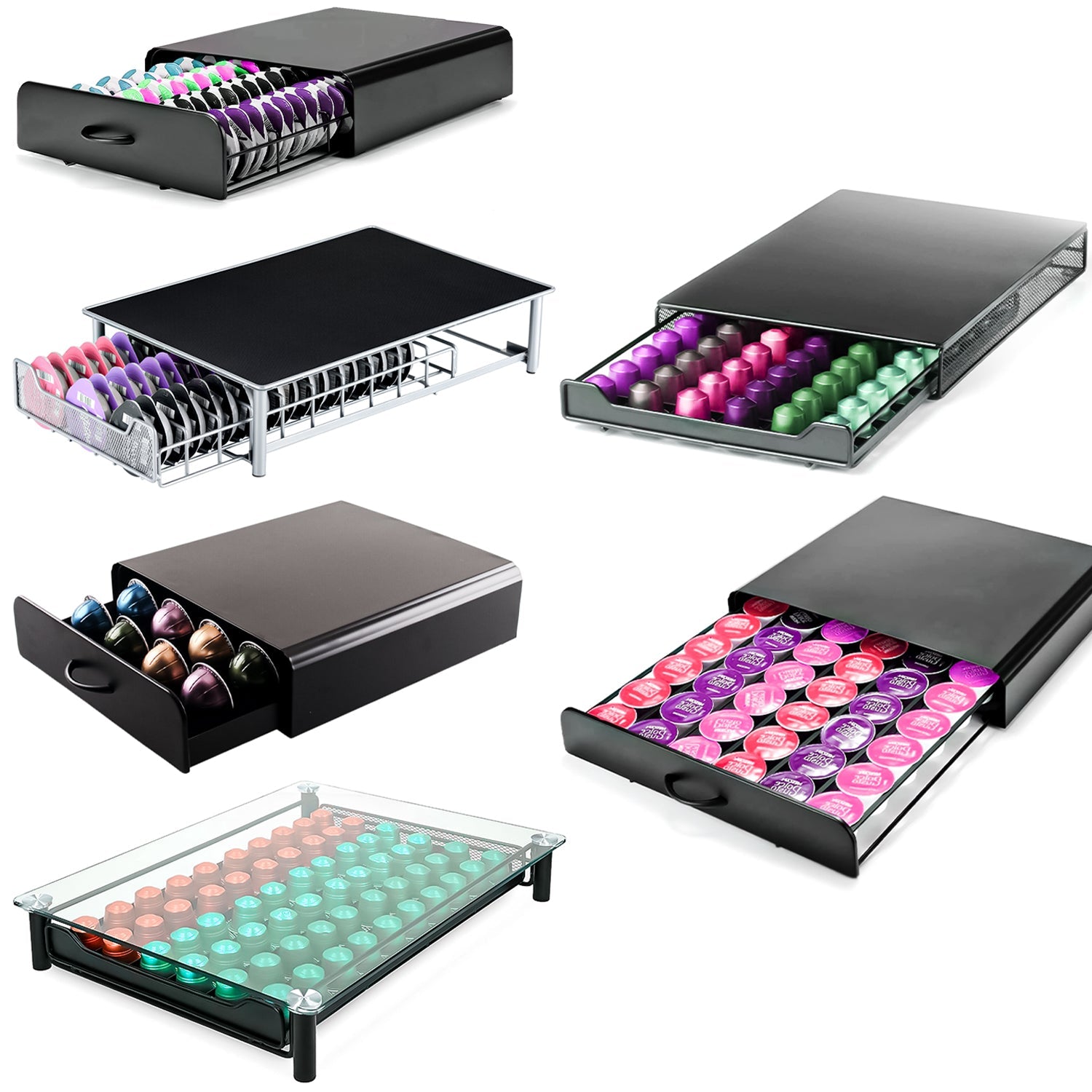These contemporary revolving coffee pod holder Tassimo/Nespresso Dolce gusto capsules holder stands are stylishly designed to allow you to hold all of your coffee pod capsules in one place. It is made of chrome, a perfect storage unit for your kitchen.