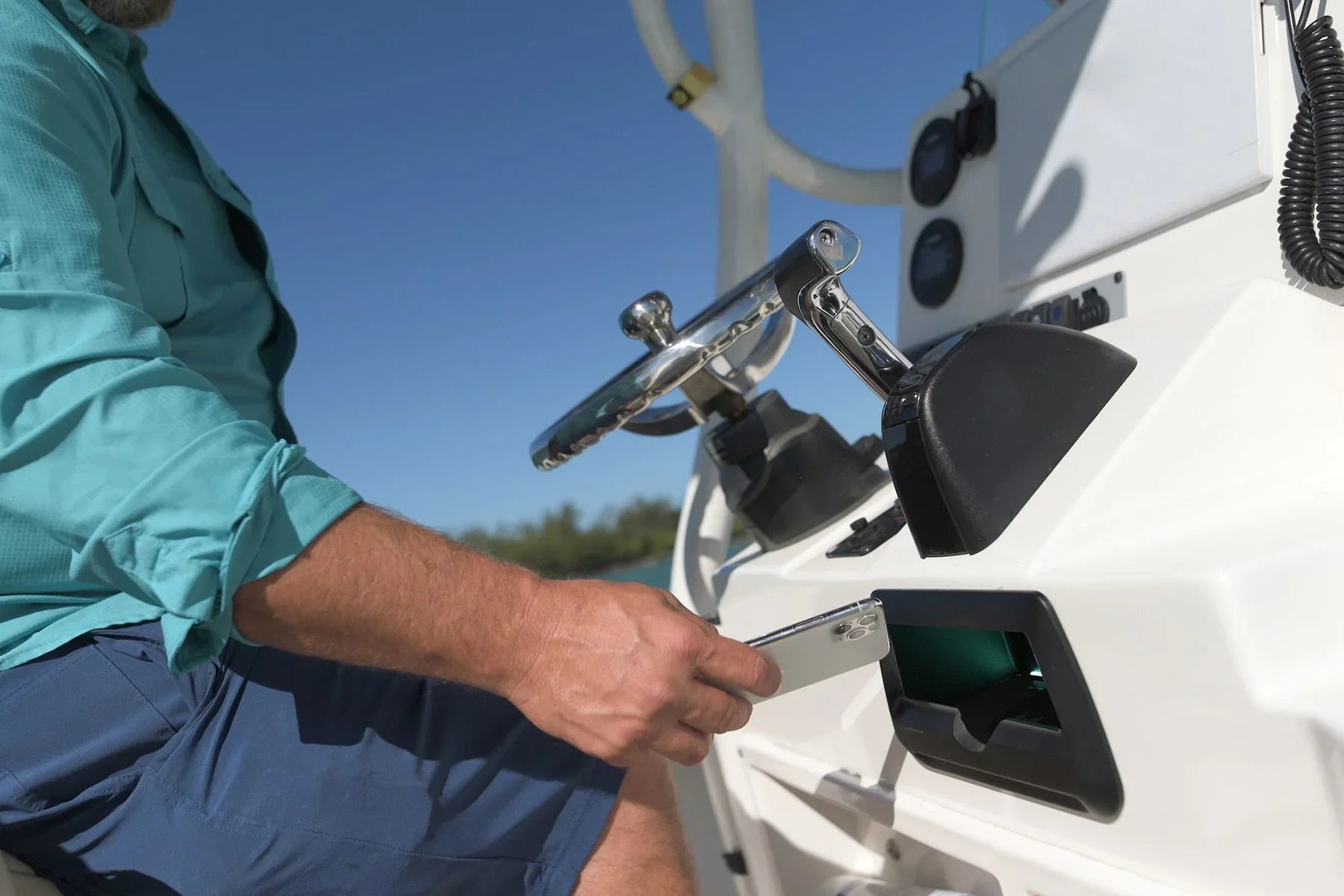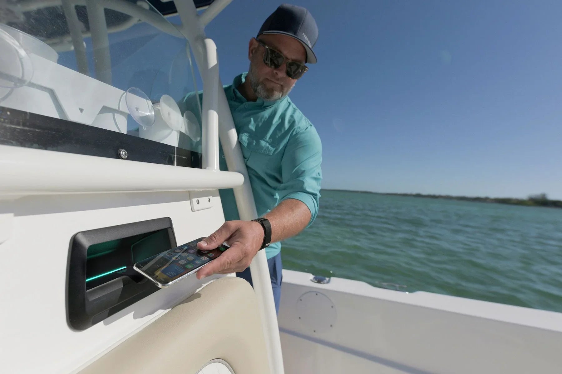 Rounded corners and tapered front design eliminate all snagging risks, making it possible to install in high-traffic areas of the boat where phone charging/storage until now has been impossible.