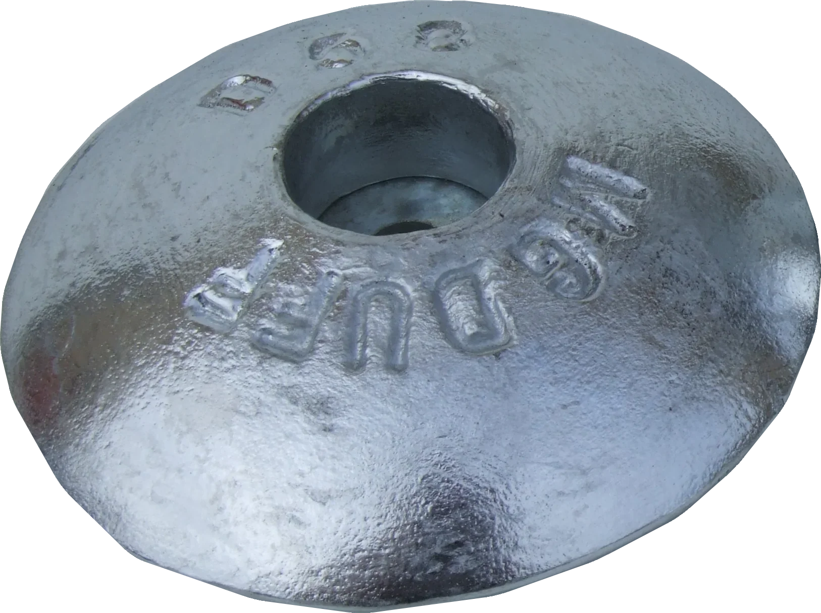 Disc-shaped zinc sacrificial anode for hull and underwater fitting corrosion protection in seawater environments.