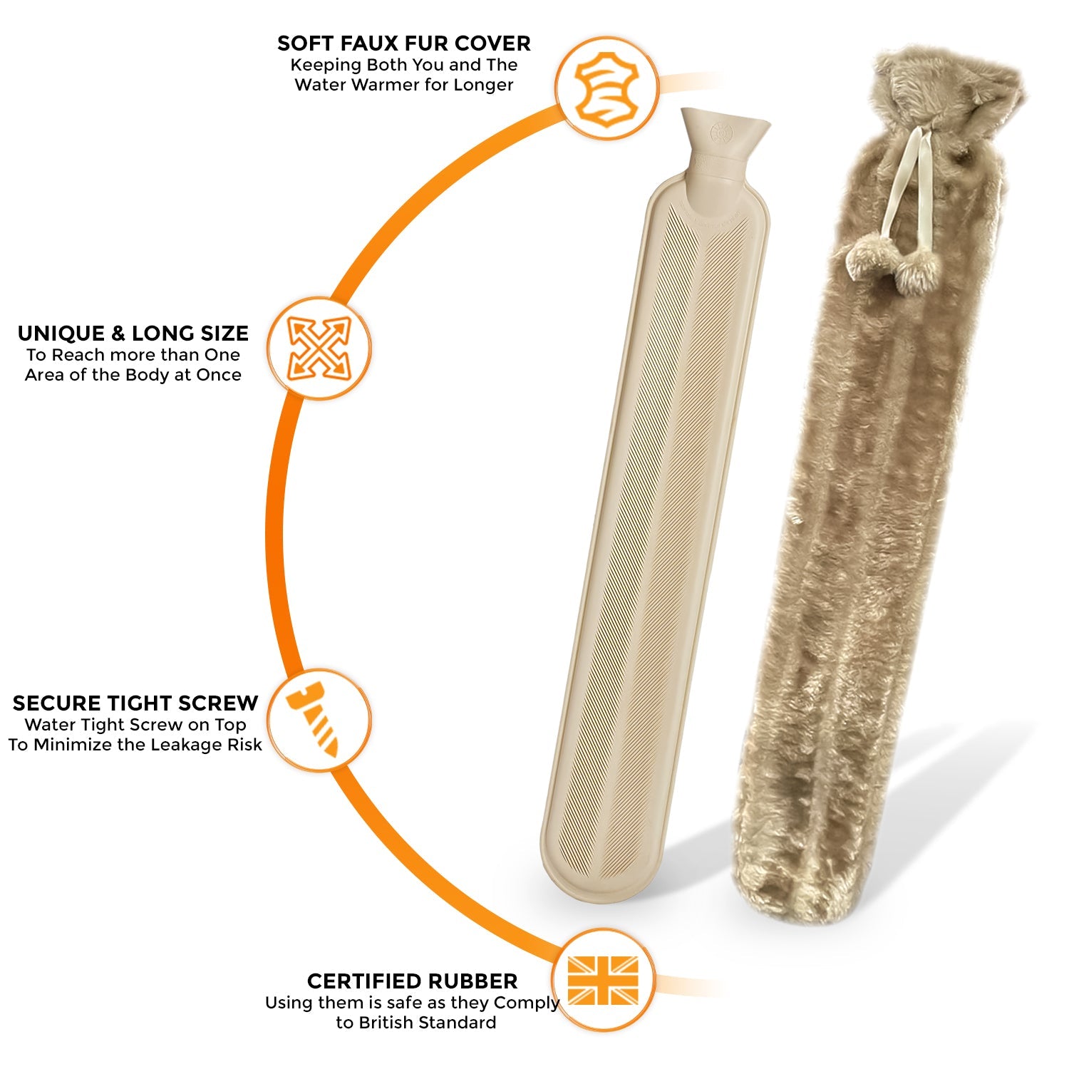 This light grey hot water bottle is a wonderful way to keep the cold weather at bay. Curl up in your little bubble of warmth, the extra long hot water bottle wraps around your body to give you a hug of soothing warmth. The hot water bottle is a great way to sooth all those little the aches, pains, and muscle pains. The extra long bottle can hold more water than a standard sized water bottle, and the extra fluffy cover results in this hot water bottle feeling like a soft hug of warmth.