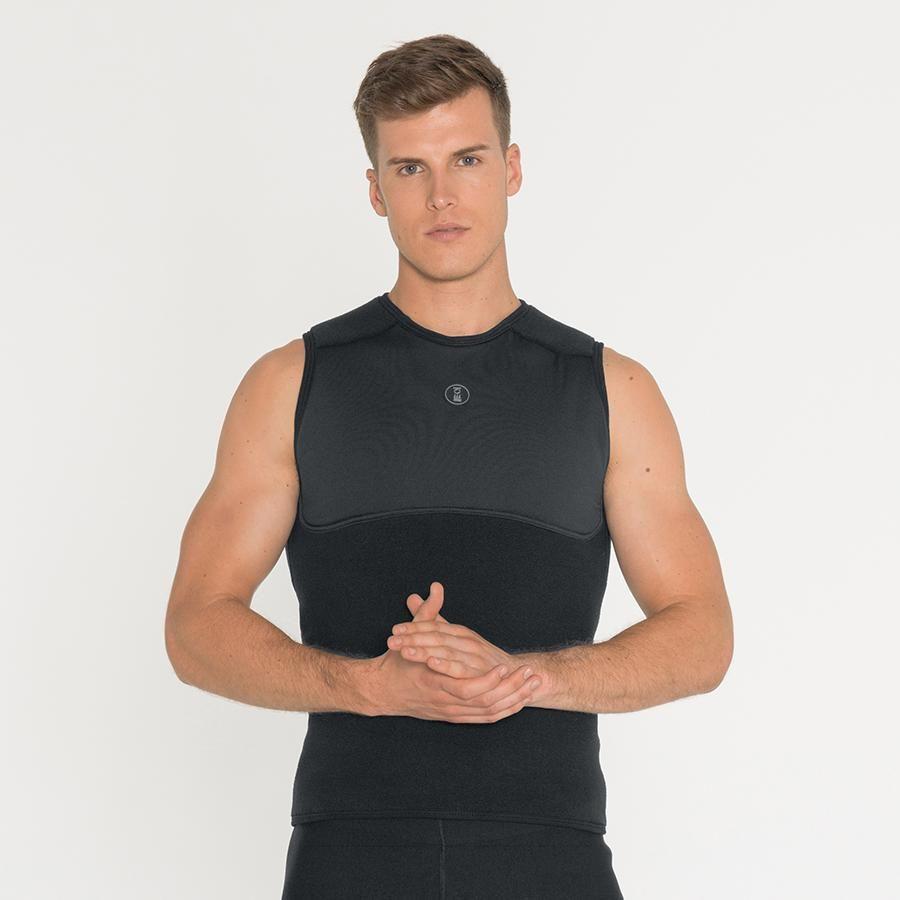 The sleeveless design of the vest minimises impact on buoyancy and overall bulk especially in the shoulders and arms where freedom of movement is critical. The four-way stretch fabric combined with long body design ensures a snug fit, minimising cold points. The additional chest panel helps to minimise the rush of cold air from the inlet valve and provides extra thermal protection in a key exposure area. The fast wicking fabric moves perspiration towards the outer surface, keeping the wearer drier and warmer.