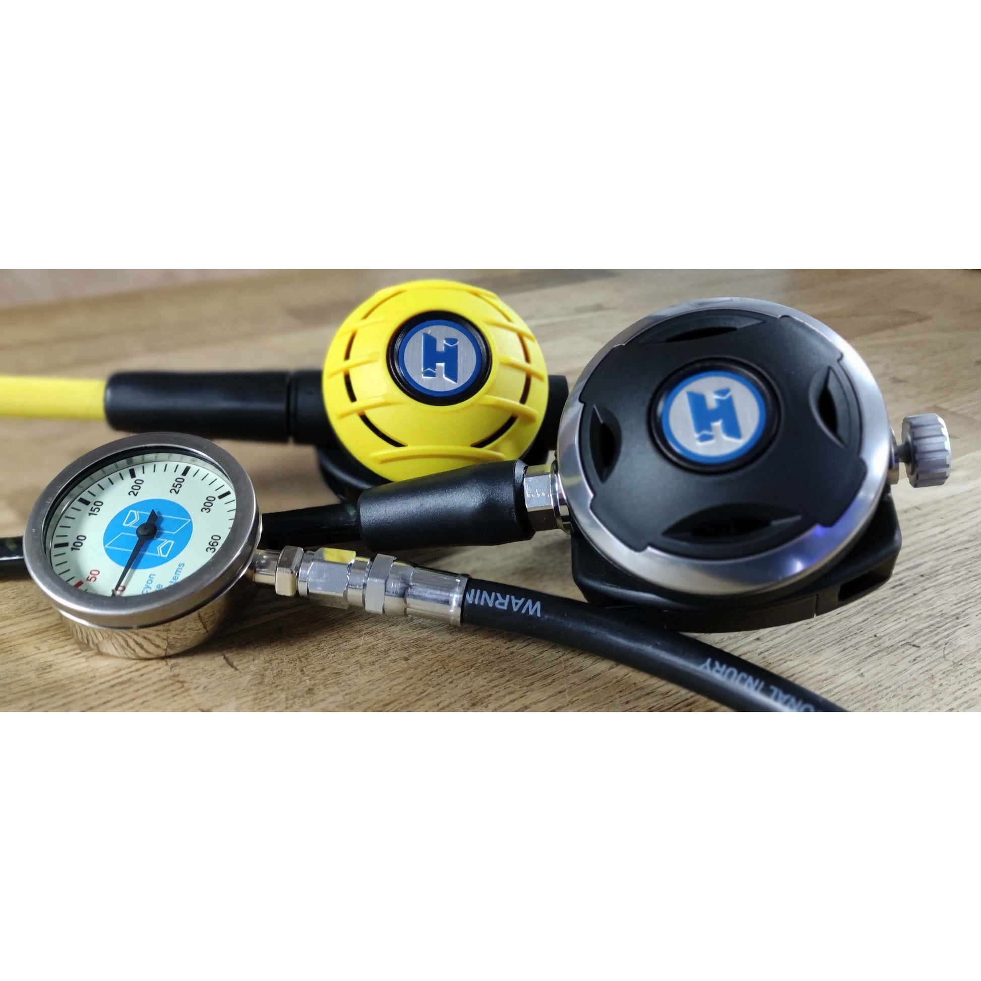 A beautiful set up featuring the H-50D 1st stage, a sealed diaphragm regulator, for all weather and working conditions. On the 2nd stage end you'll find a Halo primary regulator and an Aura in yellow as your octopus. All on high quality hoses with an oversized pressure gauge for easy reading and handling.