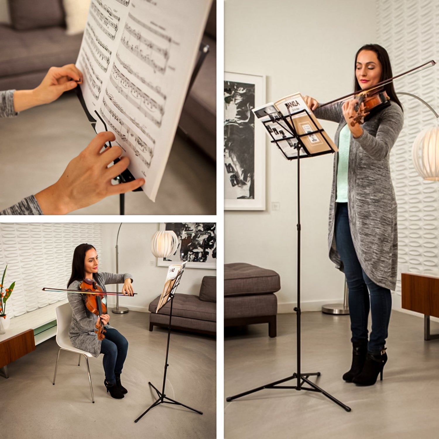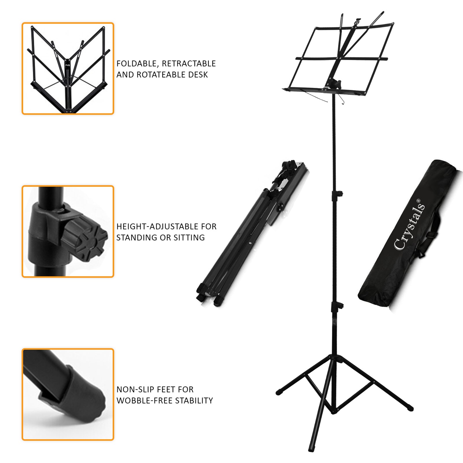Portable compact height adjustable music orchestral paper/book holder tripod stands are perfect for any amateur or professional musician, this orchestra quality music stand comes in black and features a detachable top for easy transport and storage. The music stand has a fordable tripod base with non-slip rubber feet for extra stability, has an adjustable vertical shaft making it perfectly adjustable for sitting and standing.