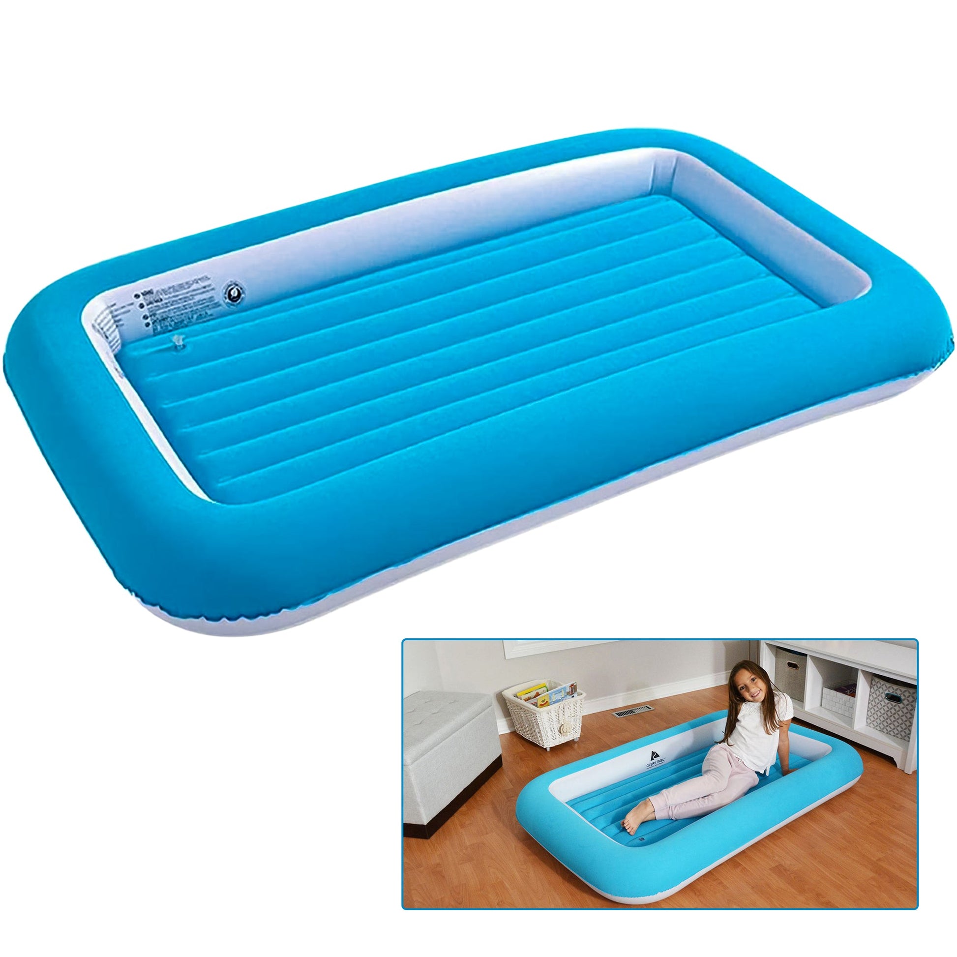 Kids Safety Bed Air mattress with high edge. The inflatable air mattress for children made of high-quality PVC guarantees pleasant nights and excellent sleeping comfort at home and on the go. The mat is suitable for boys and girls due to its three different colours. Whether outdoor for camping, scout, holiday camp, vacation or in the living room - the mattress enables the kids to have a restful night´s sleep. The velour-coated surface makes it non-slip and provides a comfortable hold. The height of 17.5 cm guarantees optimum comfort. For the little ones, the air bed has a raised edge which offers additional safety during sleeping and romping. This means that the floor and the edge can be inflated separately from each other.