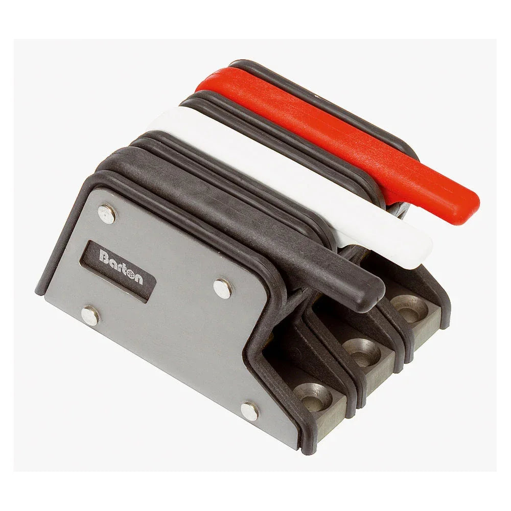Compact triple rope clutch for securing halyards and control lines on small yachts and for lighter duties on larger craft.