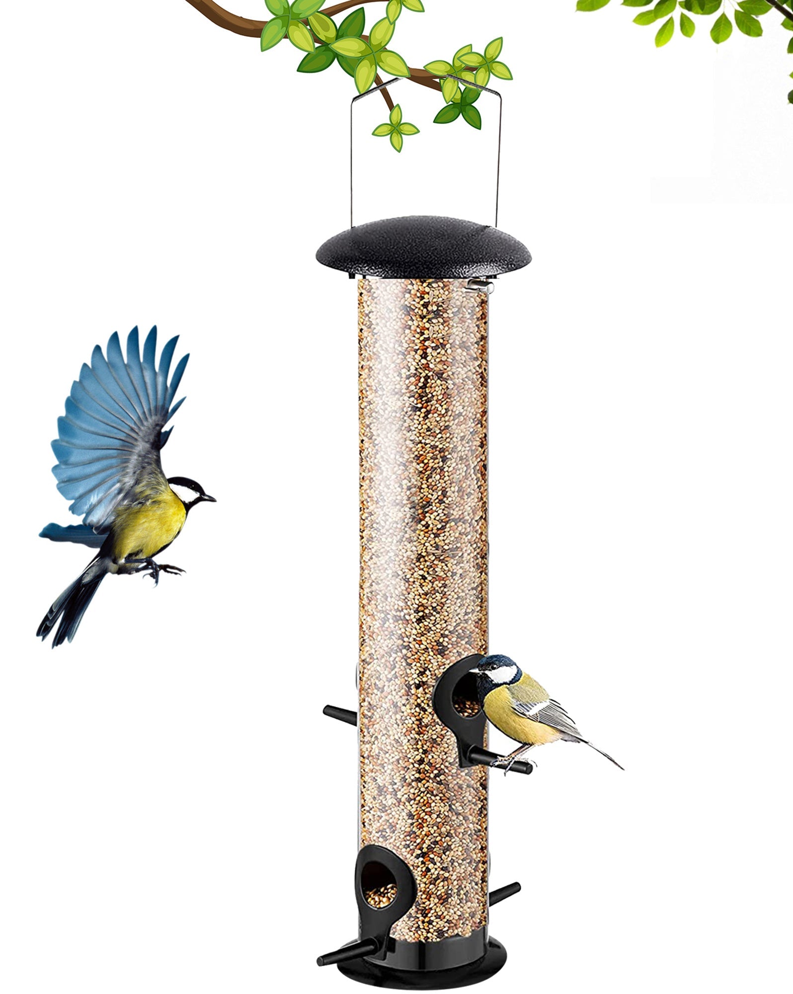 - Feeders can be hung from trees and bird tables.