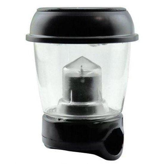 White LED rail-mounted light with a detachable head. Solar charging powers an internal battery, and the unit switches on at dusk and off at dawn for hands-free operation.