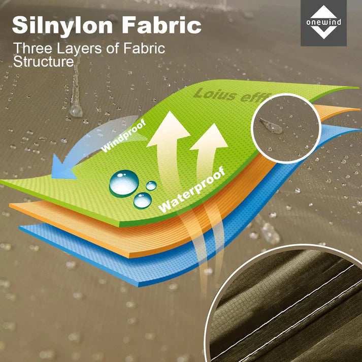 Made from 1.1oz silnylon ripstop fabric, it's waterproof to 3,000mm and offers protection against sun, rain, snow, and wind! Weighing just 1.9kg, including all suspensions and packing down to a compact 45cm x 12cm, it's super convenient for hiking and backpacking trips.
