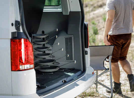 The Pan Rack allows you to safely store your pans in the campfire kitchen, campervan, or caravan. Even if you carry the rack to another place, the pans will stay securely in place. The robust rack made of powder-coated steel serves you during your long outdoor cooking adventures to set down, dry and store your pans for longer. Thanks to the high-quality surface in proven Petromax quality, you can clean the shelf quickly and easily with a damp cloth and a little dishwashing liquid.
