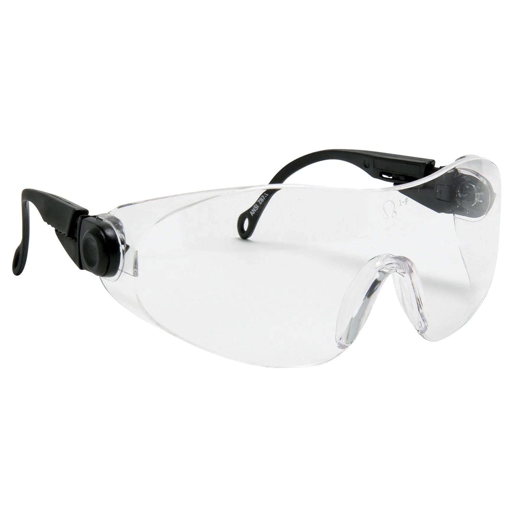 Clear wraparound safety spectacles with double-arm adjustment for a secure, customised fit.