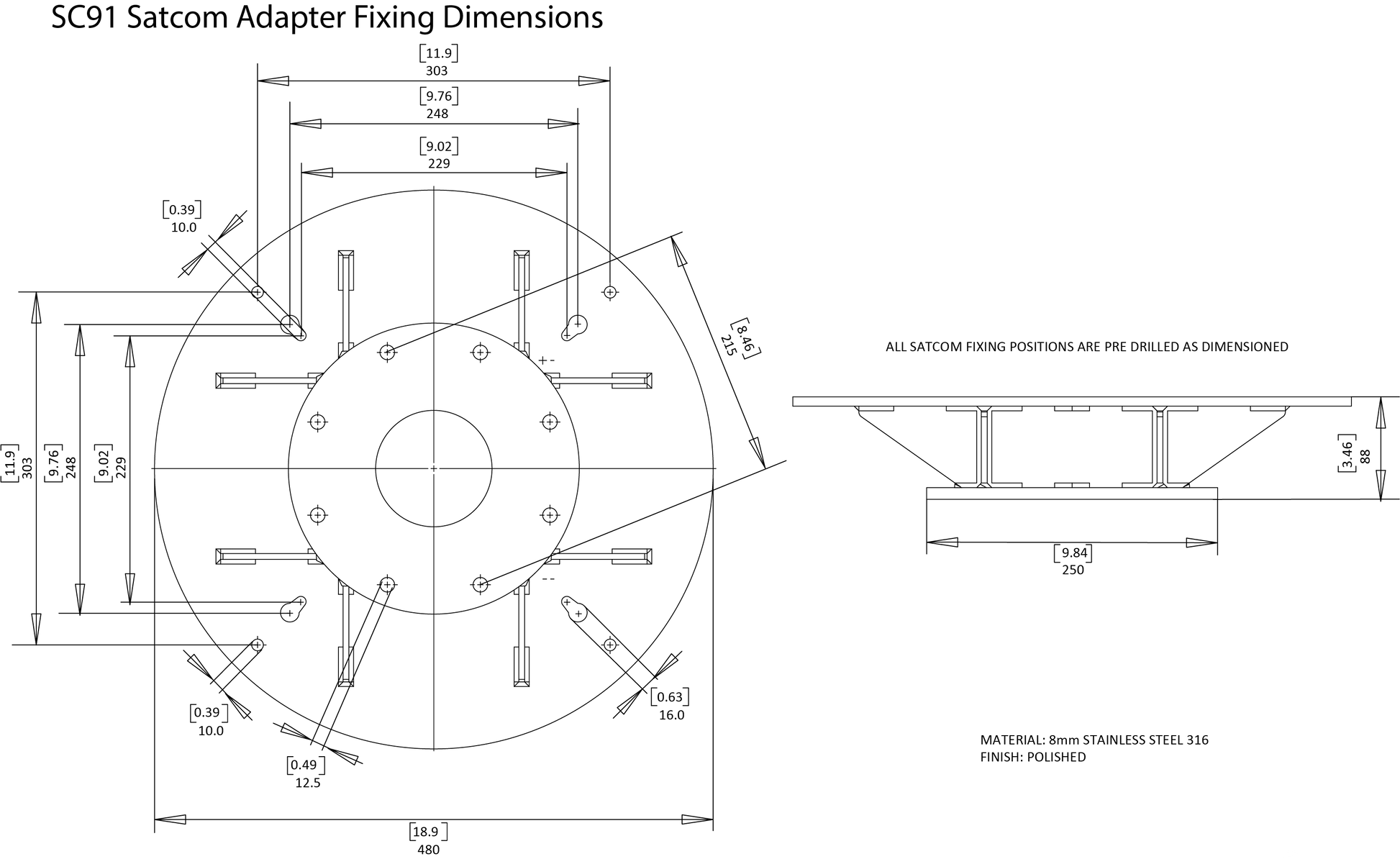 SC91 Satcom Antenna Stainless Mount - made to order for large Satcom domes; mirror-polished marine-grade 316 stainless for an ultra-robust, hi-end finish.