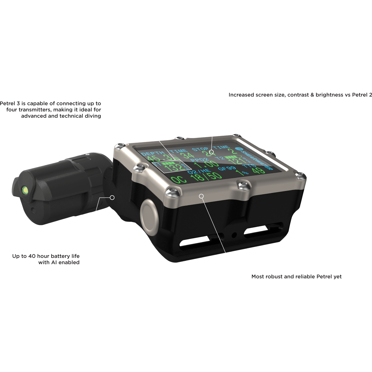 PETREL 3 is available in standalone or rebreather monitoring models, including DiveCAN, 4-pin AK (special order), and Fischer port connections.