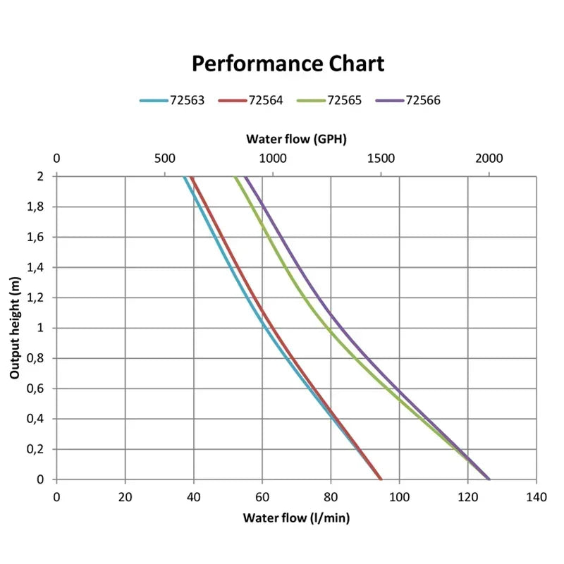 - 7,570 L/h (2,000 US gph) — rapid bilge clearing