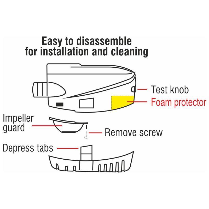 Pump with snap-on strainer base and fitted manual test button; wiring and fuse fitted.