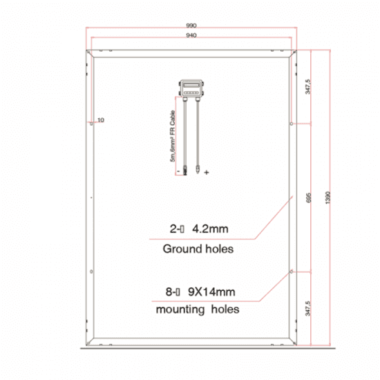 - Solar panel specifications: Peak power: 250W; Maximum power voltage (Vmp): 20.2 V; Maximum power current (Imp): 12.38 A; Open-circuit voltage (Voc): 23.9 V; Short-circuit current (Isc): 13.12 A; Power tolerance: ±3%; Dimensions: 1640 x 992 x 35 mm; Weight: 15.3 kg (33.7 lb); 8 mounting holes 9 x 14 mm; 2 x 5 m of high-quality single-core solar cable (2 x 16.4 ft).