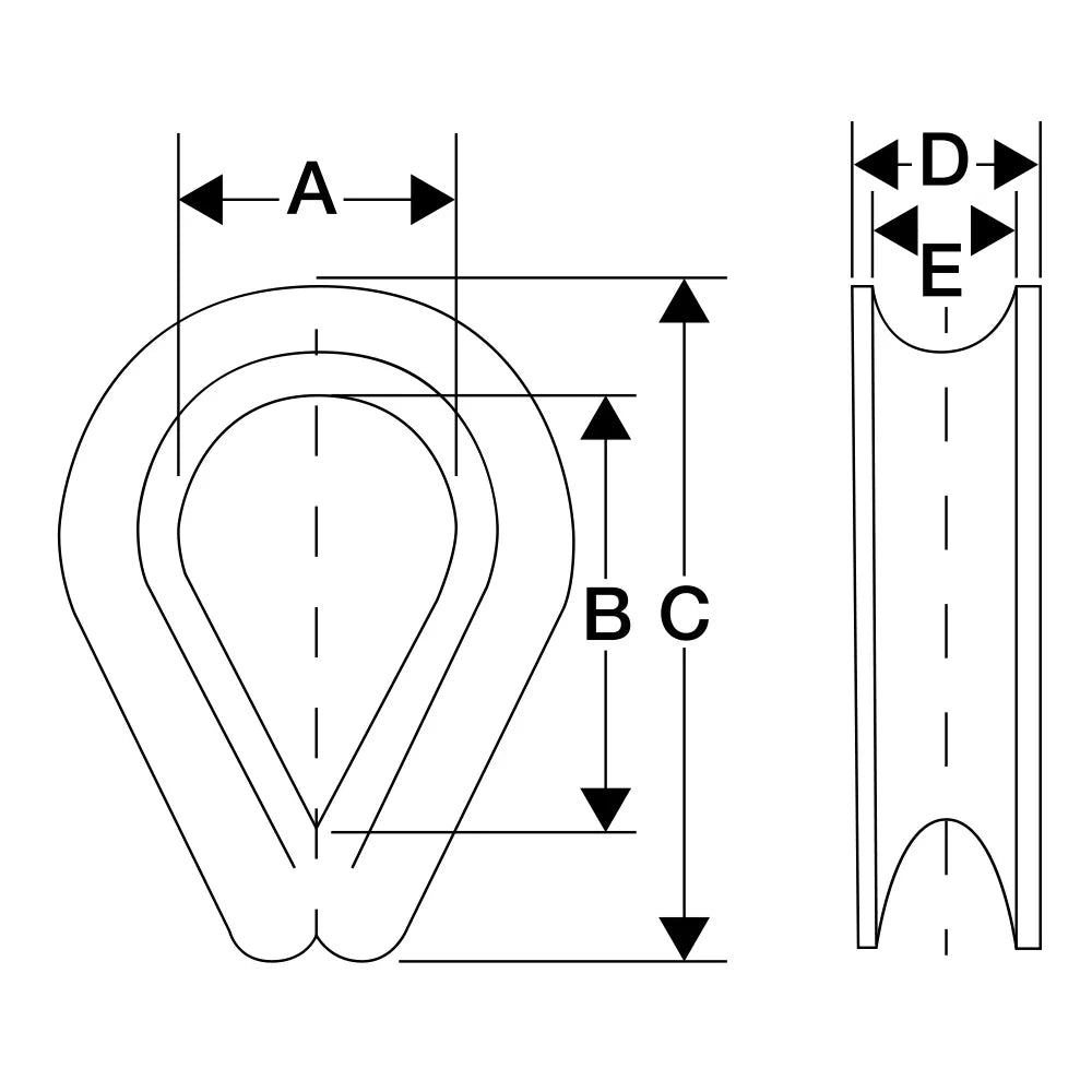 Durable stainless steel thimble designed to protect 18 mm (0.71 in) rope eyes from chafe and wear.